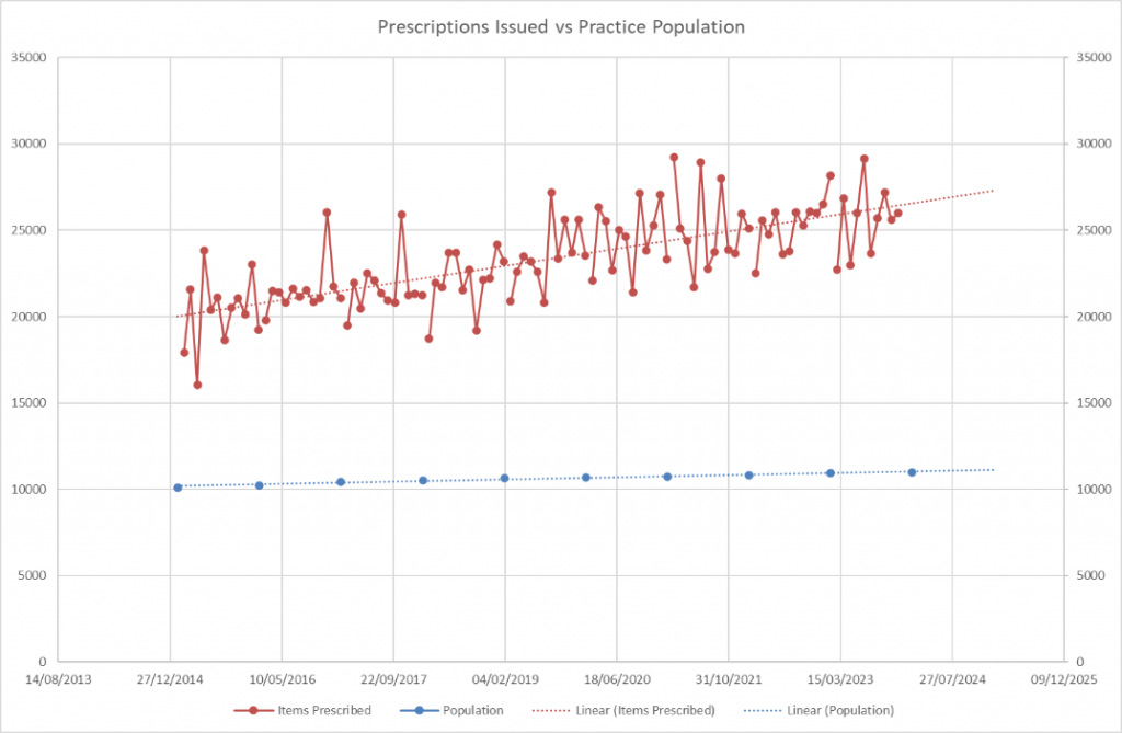 Over the past decade, our workload, measured using prescription volumes as a proxy measure, has increased by approximately 25%, despite only a modest rise in our registered patient population. This suggests that the growing demand is largely driven by demographic change, particularly an ageing population with more complex health needs.